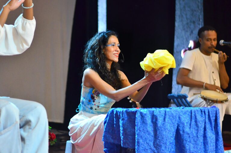 Flores D’Água – Contadoras de Histórias convida o público a embarcar em histórias que nascem às margens dos rios e florescem na escuta das infâncias. Com contação, música ao vivo, presença de Libras em cena e palavras em língua indígena, a apresentação valoriza a diversidade, a memória das águas e a força das narradoras pretas e ribeirinhas. Uma experiência sensível, inclusiva e potente, que celebra os saberes ancestrais e convida o público a cuidar do que sustenta a vida.